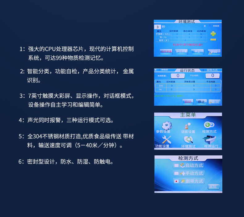 6、檢測到微量金屬時,聲、光、儀表同時報警,不合格產(chǎn)品自動返回到停止狀態(tài)和排除裝置控制分離。