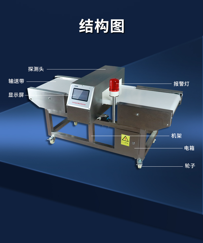 6、檢測靈敏度:直徑0.8-3.0mm鐵球,1.5-5.0mm不銹鋼(探測精度與機器的高度和寬度有直接關(guān)系,通常高度越高,寬度越寬,機器的探測精度越低,反之,相反。)