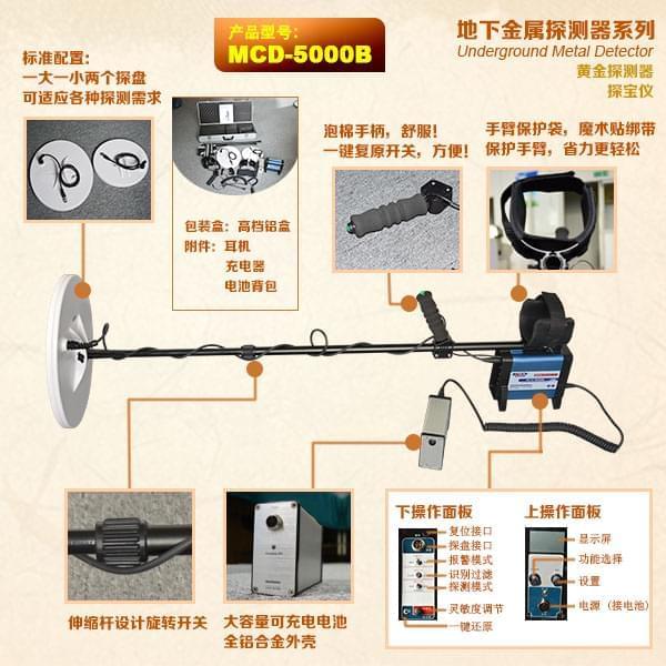 MCD—5000B是一款性能優異的金屬探測器,該探測器采用微電腦芯片控制具有靈敏度高和性能穩定的特點,除了能檢測平常的金屬外還能識別非鐵類金屬和有色金屬,如:沙金,金銀混合物銀金等等,實為同類產品中的最高水平。它能讓您輕松找到您需要的金屬物品,這是其它的同類產品所不具有的功能。擁有該款探測器后,您可以去更多的地方展開探寶活動,挽救那些被埋藏在地下的珍貴文物和寶藏,如:搜尋古錢幣、珠寶、金銀制品等等。注:本儀器不得用于非法活動,否則后果自負