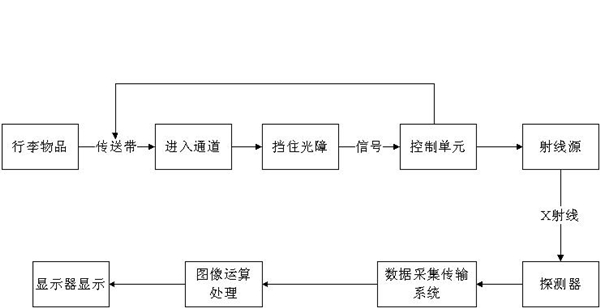 物品進入通道式X射線安檢機通道后,檢測裝置將相關信息送至控制單元,由控制單元觸發X射線源發射X射線。X射線經過準直器后形成非常窄的扇形射線束,穿透傳送帶上的行李物品落到探測器上,探測器把接收到的X射線變為電信號,這些很弱的電流信號被放大后量化,通過通用串行總線傳送到工業控制計算機作進一步處理,經過復雜的運算和成像處理后得到高質量的圖像。其工作原理如圖所示: